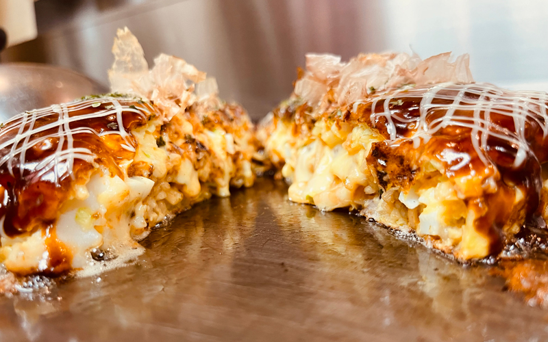 昔ながらの製法にこだわり、中力粉を使った素朴な生地と店独自の茹で卵のマヨネーズ和えを封入することで、独特の食感を表現しております。他のお店にはない創作お好み焼きとして、長年にわたり遠くから来店される方も多くいらっしゃいます。