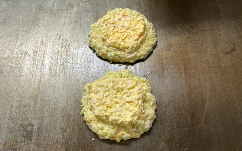炒り卵を上にのせてみたり、スライスの茹で卵を挟んでみたり、色々試しているうちに現在のゆで卵のマヨネーズ和えをお好み焼きの中に入れるスタイルの「たまやき」になりました。
