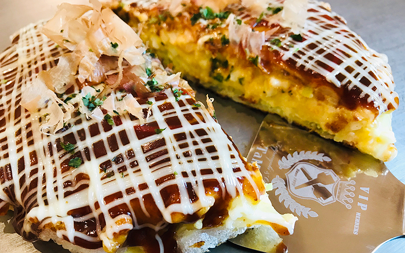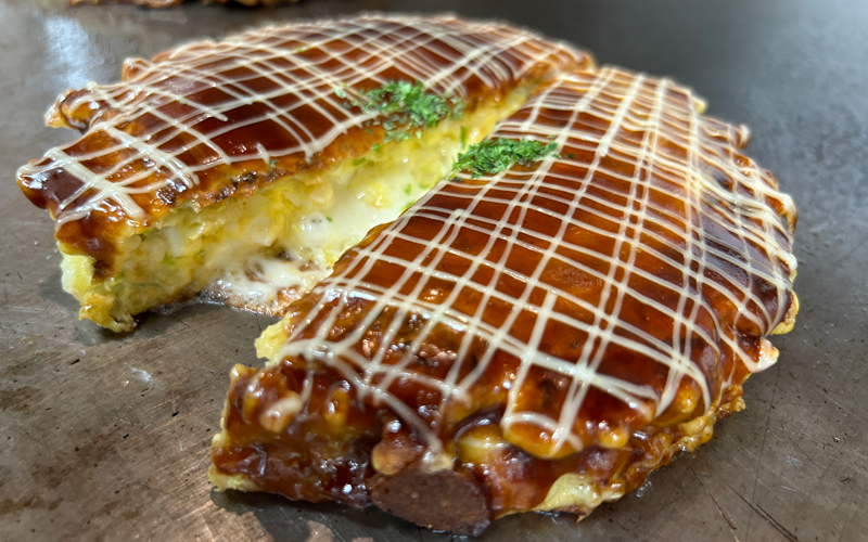 昔ながらの製法にこだわり、中力粉を使った素朴な生地と店独自の茹で卵のマヨネーズ和えを封入することで、独特の食感を表現しております。他のお店にはない創作お好み焼きとして、長年にわたり遠くから来店される方も多くいらっしゃいます。